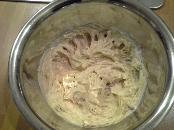 100 g Butter (Zimmertemperatur) mit 2 dl Zucker verrühren. 2 TL Backpulver und 1 Ei hinzufügen, danach 4 dl Mehl und 1,5 dl Milch. Alles gut verrühren, aber nicht „totrühren“. Den Teig in eine gefettete und gebröselte runde Springform mit abnehmbaren Rand füllen. Den Teig vorsichtig glatt streichen, so dass er gleichmäßig verteilt ist.