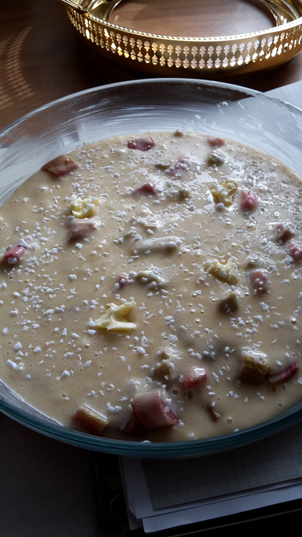 100 g Butter schmelzen und etwas abkühlen lassen. 4 Eier trennen und das Eigelb mit 2 dl Zucker schaumig rühren. Die Butter und 2 dl Filmjölk unterrühren. 3 3/4 dl Mehl mit 1 EL Backpulver mischen und ebenfalls zu der Masse geben. Untermengen zu einem glatten Teig. Den Teig in eine gefettete oder mit Backpapier ausgelegte Form geben (ca. 25×30 cm).