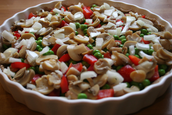 Für den Paj-Boden nimmt man 3 dl Mehl (ich nehm hierbei gern Vollkorn), ca. 125 g kalte Butter und 2-3 EL Wasser sowie 1 Prise Salz. Alles zusammenkneten und in eine ungefettete Paj-Form drücken. Mit einer Gabel ein paar Löcher reinpieksen.