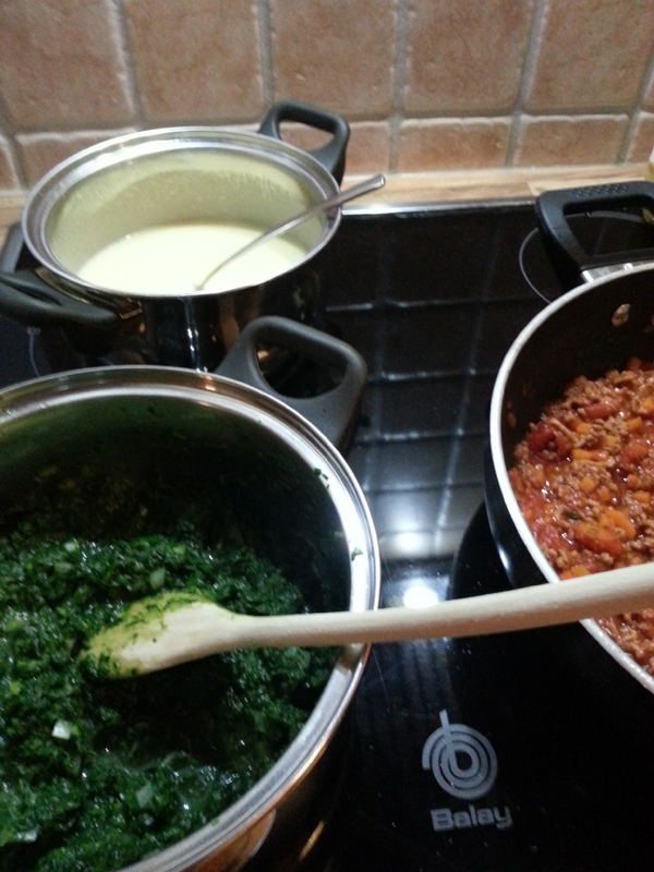 Ofen auf 200 Grad (Umluft 175) vorheizen. 2 EL Béchamelsauce auf dem Boden einer gefetteten Auflaufform verteilen, darauf den Spinat verteilen. Nicht vorgekochte Cannelloni mit der Hackfleischsauce befüllen und auf das Spinatbett legen bzw. stapeln. Béchamelsauce darüber verteilen. mit 1 gewaschenen, in Scheiben geschnittenen Tomate belegen und mit 125 g gewürfeltem Mozzarella und 50g frisch geriebenem Parmesan überstreuen. Ca. 40 Min. im Ofen backen.