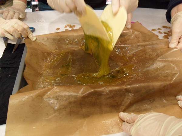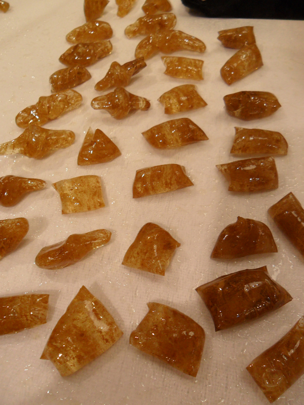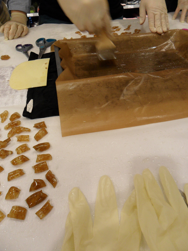 Aber zurück zu den Bonbons… Wir waren 6 Teilnehmerinnen und durften zwischen verschiedenen Farben und Geschmäckern wählen. Es wurden schließlich rote Erdbeer-Bonbons, grüne Mango-Lime-Bonbons und braune Lakritz- bzw. Lakritz-Salmiak-Bonbons. Die reinen Lakritz-Bonbons seht Ihr auf dem allerersten Bild oben. Wir waren allerdings beim ersten Versuch noch zu zaghaft, so dass sie eher süß mit nur einem Hauch von Lakritze schmecken. Dafür sind sie sehr hübsch geworden, fast wie Bernstein… Für die grünen haben wir gelbe Farbe mit grüner Farbe gemischt, jedoch im Verhältnis mehr grün als gelb. Melli, mit der ich da war, hat schleifenförmige Bonbons geformt. Passt. Melli-Schleifchen, würde ich sie nennen.