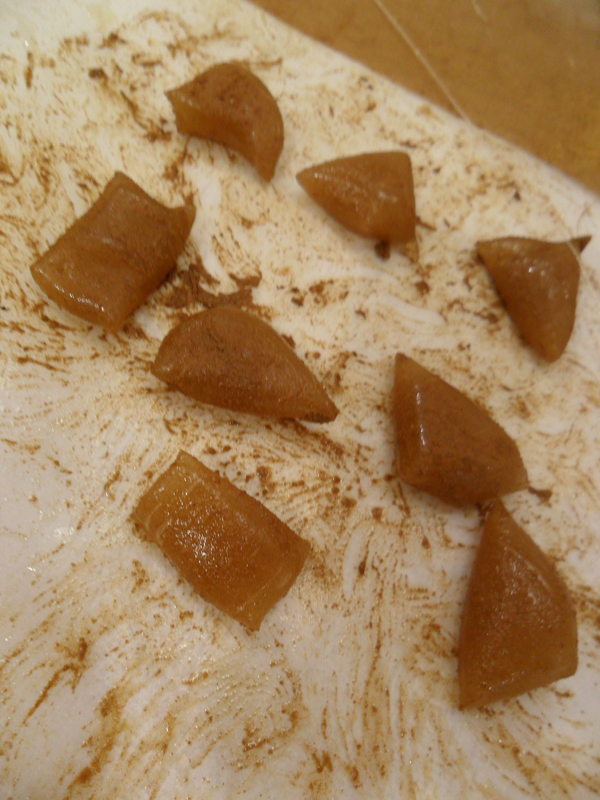 Wenn dann die Masse gleichmäßig ist (oder farbig marmoriert, wie bei den Lakritz-Bonbons), dann trennt man mit einem Schaber ein Stück ab und formt es mit der Hand zu einer Rolle (am besten eingeölte Handschuhe tragen). Danach mit einer eingeölten Schere Stücke abschneiden und ggf. Bonbons mit den Händen nachformen. Alles auf einem Stück eingeölten Backpapier erkalten lassen. Dabei darauf achten, dass die Bonbons sich nicht berühren, weil sie sonst zusammenkleben. Man kann die noch leicht warmen Bonbons auch in Pulver wälzen. Das habe ich bei den Lakritz-Salmiak-Bonbons gemacht. Nicht hübsch, aber lecker!